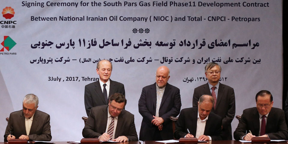 نخستین قرارداد نفتی پس از برجام با شرکت فرانسوی توتال به منظور توسعه بخش آبی فاز ۱۱ پارس جنوبی و در قالب قراردادهای جدید منعقد شد. این قرارداد که از روی نخست عقد آن و حتی روزهای قبل تر با حواشی زیادی دست و پنجه نرم کرد، شامل بخشهای مختلفی است که شرکت توتال متعهد شده است که ۵۱ درصد از آن را با استفاده از توان داخلی کشور انجام داده و در مقابل امتیاز بگیرد.